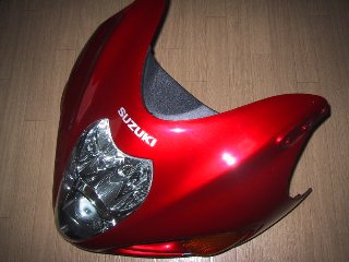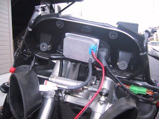 フロントカウルを外して、バラストを配置する場所を探します。 いろいろ探した挙句、最高にぴったりの場所がありました。 メータの後ろ側です。ここなら邪魔になりません。 両面テープやガムテープで脱落しないようにしっかり固定します。 |